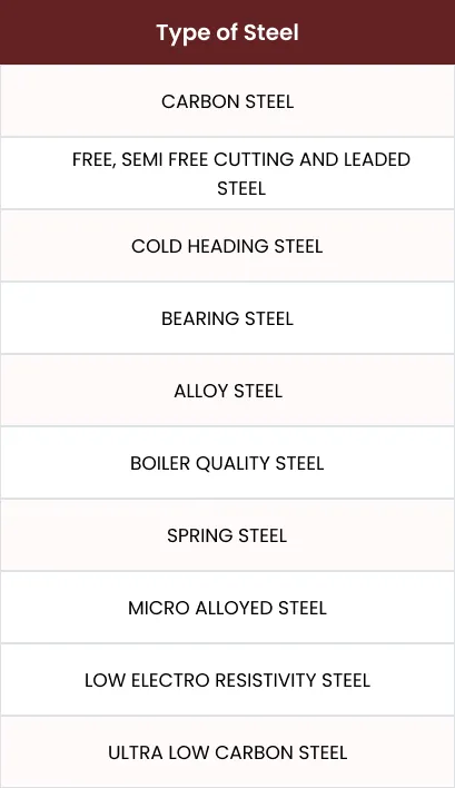 | CARBON STEEL | FREE, SEMI FREE CUTTING AND LEADED STEEL | COLD HEADING STEEL | BEARING STEELS |